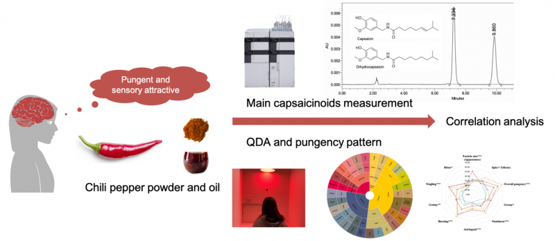 精確確定辛辣度對(duì)于辣椒的工業(yè)應(yīng)用至關(guān)重要。然而,由于辛辣感持久且易引發(fā)疲勞,需要找到一種方法來補(bǔ)充或部分替代感官評(píng)價(jià)來確定辛辣感。斯科維爾單位(SHU)常被用來表示辣椒的辛辣感,該單位是通過將樣品中的辣椒素和二氫辣椒素的濃度轉(zhuǎn)化得到的[5]。然而,SHU是否與感官結(jié)果匹配仍需進(jìn)一步驗(yàn)證。此外,感覺到的辛辣度和化學(xué)測(cè)定濃度之間的關(guān)聯(lián)性僅限于單一的辣椒素[6]。因此,需要在各種不同的產(chǎn)品基質(zhì)中進(jìn)一步探索。