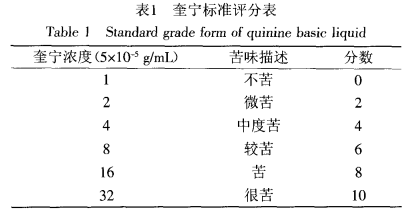 本文首先對大豆肽的苦味特性進行人工感官評價,然后冉研究電子舌儀器進行感官分析。本實驗從對苦味敏感的專業(yè)人員中選取10位感官評價員(5男5女)進行感官評價,每次品嘗之后,需要用清水漱口,再進行下一次品嘗。最后,將與其口味接近的奎寧標準液濃度對應(yīng)的分值記為此溶液的得分。之后取10位評價人員的平均分為苦味評定分數(shù)。以奎寧的作為評分標準,評分標準見表1。表2為風(fēng)味蛋白酶不同水解時問下的苦味得分值。