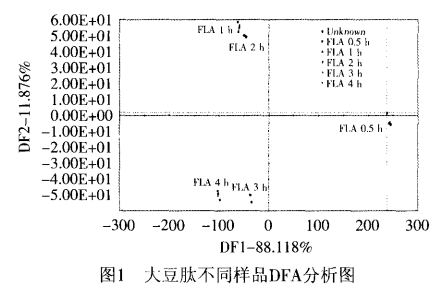 采用法國AlphaMOS電子舌對制取的五種不同酶解時間條件下的樣品進行苦味特性研究。分別采用DFA模式識別方法和PLS預(yù)測模型對采集的數(shù)據(jù)進行定性和定量分析,研究表明:采用DFA分析法能夠?qū)ξ宸N不同的大豆肽樣品的呈味特性和味覺相似程度進行定性評價,PLS模型能對未知樣品進行呈味預(yù)測;大豆肽的苦味預(yù)測結(jié)果與實際感官評價吻合。研究結(jié)果為后續(xù)大豆肽產(chǎn)品的呈味特性研究提供一種新的方法途徑。