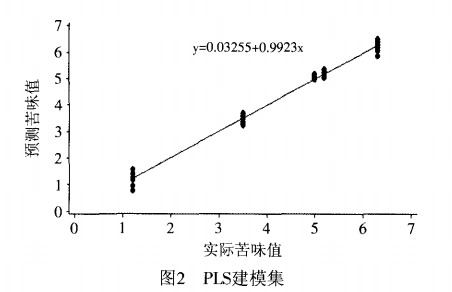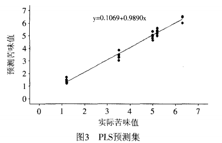 用PLS建立大豆肽溶液電子舌苦味預(yù)測模型,并對電子舌傳感器響應(yīng)值與人工感官評價得分值問的相關(guān)性進行研究。以七根傳感器的響應(yīng)信號值為白變量,以感官得分值為因變量構(gòu)建偏最小二乘模型。建模集為60個樣本,驗證集為30個樣本。結(jié)果如圖2、圖3所示,分別表示建模集、預(yù)測集的實際苦味值與預(yù)測值的相關(guān)圖。