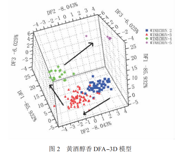 從圖 2 可看出, 醇香評分為 2、3、4、5 分樣品的分布具有明顯規(guī) 律 性。圖 中 DF1 占 85.9 %、DF2 占 8.0 %、DF3 占 6.0 %,對于分?jǐn)?shù)為 2 分和 3 分的酒樣與 4 分和 5分的酒樣沿 DF2 和 DF3 呈規(guī)律的線性變化,得分為 3 分和 4 分的酒樣沿 DF1 呈規(guī)律的線性變化。說明醇香差異由此三因素形成,其中 DF1 為最主要影響因素。