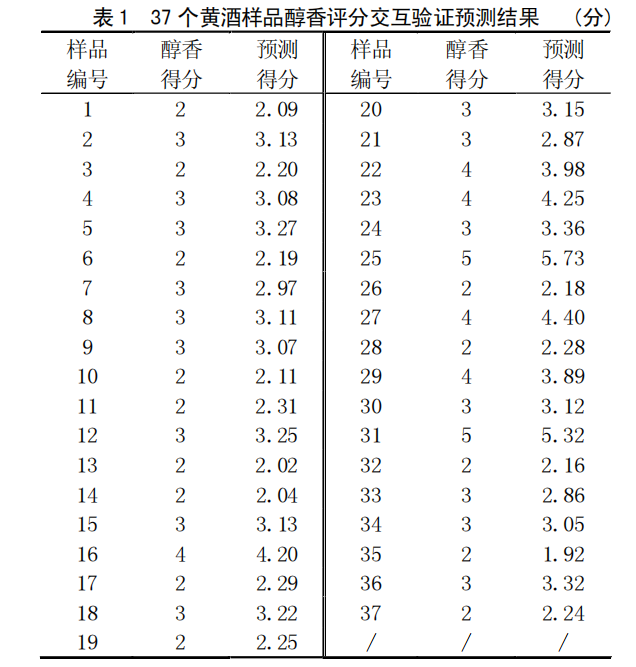 從表 1 可以看出, 所有樣品的醇香得分經(jīng)交互驗(yàn)證顯示,驗(yàn)證準(zhǔn)確率為 97.3 %。其中 25 號樣品醇香分值為5 分的酒樣,其預(yù)測得分略高,查得此樣品為 40 年陳釀,而 31 號樣品醇香分值為 5 分,預(yù)測結(jié)果相對接近,查得此樣品為 20 年陳釀。這可能是由于二者年份上的差異加上評分機(jī)制最高為 5 分,而導(dǎo)致預(yù)測結(jié)果略有偏離。在實(shí)際感官品評時(shí),不影響其得到最高分值。