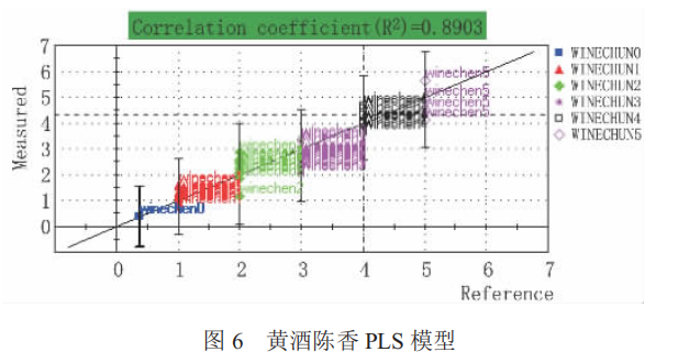 實(shí)驗(yàn)結(jié)果顯示,從醇香、陳香、焦香這 3 個(gè)因素來對黃酒的香氣成分分別建立定量模型,進(jìn)行交互驗(yàn)證后,準(zhǔn)確率分別達(dá)到 97.3 %、97.3 %和 94.6 %。本項(xiàng)目研究是基于電子鼻技術(shù)替代人體嗅覺系統(tǒng)對黃酒的香氣進(jìn)行系統(tǒng)化評價(jià)的定量模型,其預(yù)測結(jié)果重復(fù)性好、準(zhǔn)確度高,可以在生產(chǎn)、 鑒評過程中替代品酒員而應(yīng)用于黃酒的香氣感官品評,有效減少人為誤差。