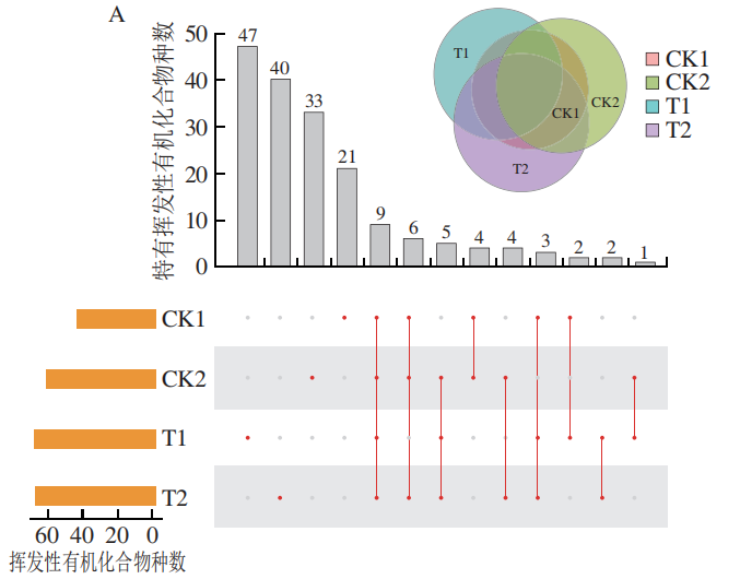 基于OAV的香氣特征分析如表4所示,當OAV>1時,定義為關鍵香氣成分,該香氣成分對總體香氣有直接影響;當0.1<OAV≤1時,定義為修飾性香氣成分,該香氣成分對總體香氣有輔助影響;當0<OAV≤0.1時,定義為潛在香氣成分,該香氣成分對總體香氣有潛在影響。在一定范圍內,OAV越大說明該香氣成分對總體風味貢獻越大。T1的關鍵香氣組分(OAV>1)為二氫獼猴桃內酯和壬醛,呈現甜桃香、木香、柑橘香、花香、焦糖香,CK2為二氫獼猴桃內酯,呈現甜桃香、木香,T2為二氫獼猴桃內酯、壬醛、苯甲醛和苯乙醛,呈現甜桃香、木香、柑橘香、花香、焦糖香、苦杏仁味、堅果香、玫瑰香、巧克力香。二氫獼猴桃內酯在T1、T2和CK2 3 種茶樣香氣中均占主導地位,其OAV以T1最高,為4.743,其次是T2為1.586。