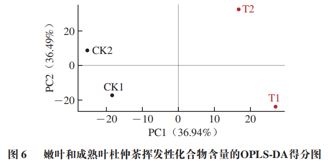 如圖6所示,模型累積解釋率R2x為0.999 1,整體預測能力Q2為-0.704 0,置換檢驗200 次的模型R2=0.999 1,Q2=-0.862 5,并且Q2回歸曲線與Y軸的截距小于0,表明模型不存在過度擬合現象,結果較為可靠。在OPLS-DA中,茶樣之間距離越小則差異越小,反之則意味著差異較大。CK2、T2、CK1和T1分別置于4 個象限,表明杜仲嫩葉茶和成熟葉茶揮發(fā)性化合物組成在蒸汽爆破處理后均發(fā)生了顯著變化,同時,嫩葉茶和成熟葉茶之間的揮發(fā)性化合物組成存在顯著差異。整體上,4 種處理的揮發(fā)性化合物組成均能被有效區(qū)分開。