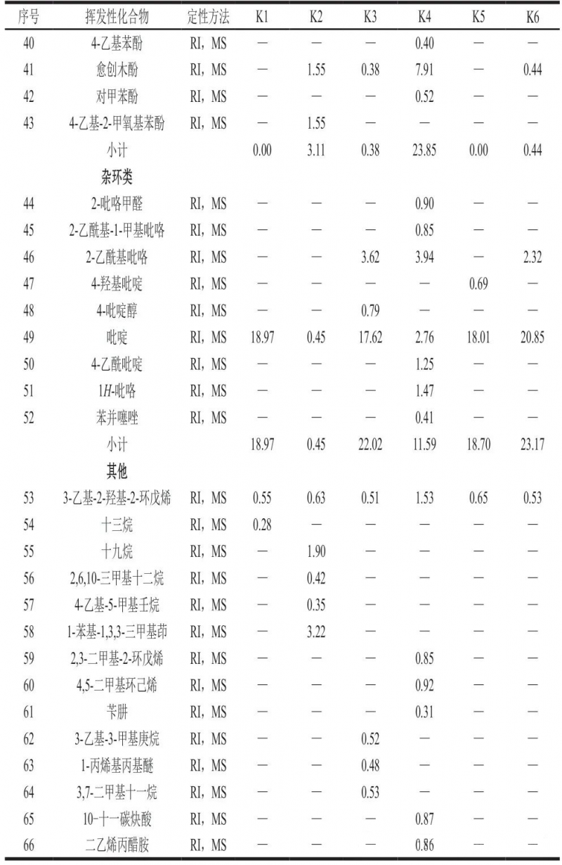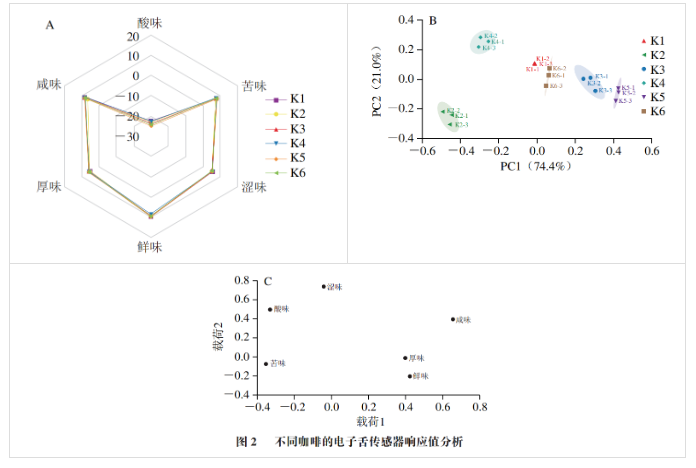 02 不同咖啡的滋味輪廓分析利用電子舌快速分析滋味輪廓,如圖2A所示。6種樣品的雷達(dá)圖輪廓類似,只有酸味傳感器的響應(yīng)值為負(fù),說(shuō)明酸味對(duì)咖啡整體滋味的貢獻(xiàn)較小。各樣品在鮮味與咸味傳感器上的響應(yīng)值差異最大,表明這兩種傳感器對(duì)滋味特征的區(qū)分效果最好。為根據(jù)滋味特征進(jìn)一步區(qū)分6種咖啡,對(duì)電子舌傳感器響應(yīng)值結(jié)果進(jìn)行PCA(圖2B)。6種咖啡輪廓未重疊,滋味特征明顯,易被區(qū)分。K3、K5和K6咖啡在PC1的正方向,主要受鮮味、咸味、厚味影響;K1、K2和K4咖啡在PC1的負(fù)方向,主要由澀味、酸味、苦味影響(圖2C)。每個(gè)樣品聚類的距離與滋味特征接近度相關(guān),有相同咖啡配比的K1~K4樣品,烘焙程度不同,距離較遠(yuǎn),說(shuō)明電子舌可以區(qū)分不同烘焙度的咖啡。K5、K6咖啡分別與K1、K3咖啡輪廓接近,說(shuō)明不同的咖啡配比在一定程度上能夠彌補(bǔ)烘焙程度的差異,使不同烘焙度的咖啡具有類似的滋味輪廓。