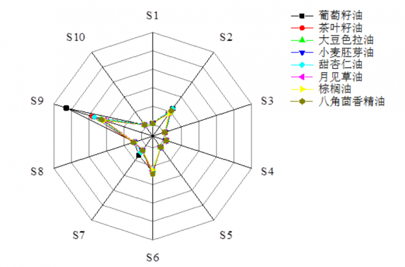 摻入植物油后的摻假八角精油樣品在色澤方面無顯著差異。下圖為純八角精油和摻假八角精油的雷達(dá)指紋圖譜,從圖中可以看出植物油摻假的八角精油和純八角精油之間的差異主要體現(xiàn)在S9號(hào)傳感器和S7號(hào)傳感器上,表明八角精油摻入植物油主要改變了其芳香類氣味,使其氣味體系發(fā)生了較大的變化。