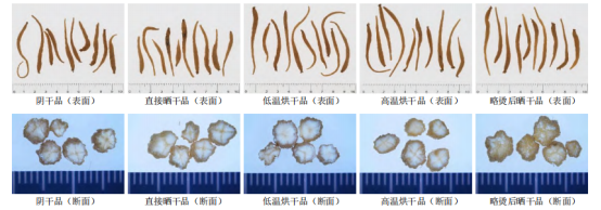 不同加工品的表面和斷面特征見圖1,5類加工品的外形沒有較大的差異,而略燙后曬干品的斷面以深黃色為主,其他加工品的斷面為黃白色至淺黃色。