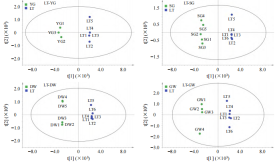 圖4 略燙后曬干品與其他加工品的OPLS-DA得分散點(diǎn)圖