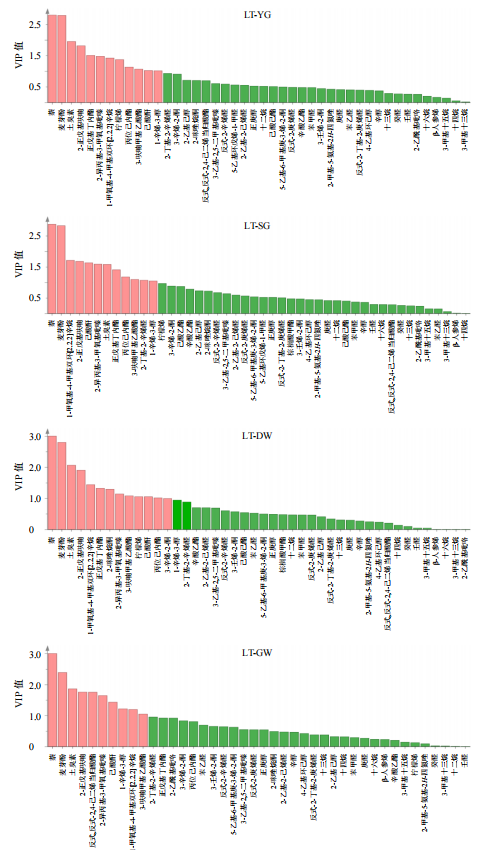 略燙后曬干品與其他加工品的氣味差異分析利用OPLS-DA將該加工品與市場主流的陰干品、直接曬干品、低溫烘干品、高溫烘干品分別進(jìn)行比較并進(jìn)行置換檢驗(yàn),確認(rèn)4組比較分析均未出現(xiàn)過擬合,將變量重要性投影(VIP)大于1的成分視為主要差異成分。得分散點(diǎn)圖見圖4,置換檢驗(yàn)圖見圖5,VIP圖見圖6。