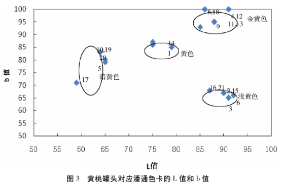 黃桃罐頭對(duì)應(yīng)潘通色卡L值和b值分布見(jiàn)圖3,可以看出金黃色b值最大在90~100之間;淺黃色b值最小,在60~70之間,黃色b值在80~90之間,暗黃色b值在70~80之間。金黃色L值范圍80~90之間,黃色L值在70~80之間,淺黃色L值最大在80~90之間,暗黃色L值在60~70之間。