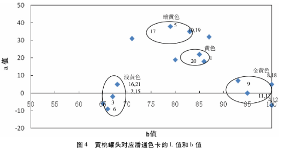 黃桃罐頭對(duì)應(yīng)潘通色卡a值和b值分布見(jiàn)圖4,由圖可以看出淺黃色的a值、b值都是最低,暗黃色的a值最大,金黃色的b值最大。從而可以得出金黃色、黃色、淺黃色、暗黃色四類顏色的a值和b值范圍見(jiàn)表4。