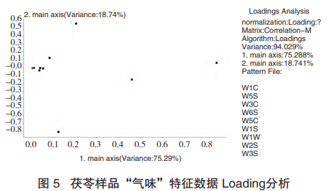 Loadings分析的算法與PCA的算法相同,是對(duì)傳感器的分析,得出傳感器區(qū)分樣品的能力。由圖分析可推測(cè),各產(chǎn)地的茯苓樣品在氣味上的差異主要來自于無機(jī)硫化物、有機(jī)硫化物、甲基類化合物和氮氧化合物。