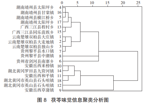 圖7為電子舌檢測(cè)結(jié)果的響應(yīng)值降維后所得的主成分分析結(jié)果??傮w來看,西南地區(qū)(云南、廣西、貴州)的茯苓樣品與岳西地區(qū)(安徽、湖北)的茯苓樣品能夠得到大致劃分。