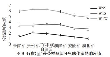 從茯苓氣味的PCA分析結(jié)果可知,在地理位置上以長江為分界點(diǎn),能有效區(qū)分長江以北和長江以南的茯苓樣品。云南、貴州、廣西、湖南的樣品生長和采收于長江以南,湖北和安徽的樣品生長和采收于長江以北。根據(jù)雷達(dá)圖可知,W5S、W1S和W1W傳感器響應(yīng)值較高,Loadings分析結(jié)果顯示茯苓氣味的差異主要來源于無機(jī)硫化物、有機(jī)硫化物、甲基類化合物和氮氧化合物。因此選擇對(duì)上述氣味靈敏的傳感器進(jìn)一步分析茯苓氣味的產(chǎn)地差異,結(jié)果如圖9所示,安徽和湖北的茯苓樣品氣味響應(yīng)值顯然低于云南、貴州、廣西、湖南的樣品,說明長江以北和長江以南的樣品在無機(jī)硫化物、有機(jī)硫化物、甲基類化合物和氮氧化合物氣味成分上存在較大差異。