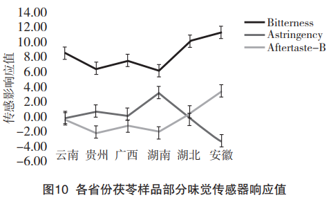 茯苓味覺信息的雷達(dá)圖分析可知,茯苓甜味顯著,但各產(chǎn)地之間差異不顯著。各產(chǎn)地的茯苓樣品味覺值的差異主要集中在苦味、澀味和苦味的回味上。因此,選擇苦味、澀味、苦味的回味進(jìn)行分析探討產(chǎn)地之間的差異,結(jié)果如圖10所示。由圖可知,湖北和安徽的茯苓樣品苦味和苦味的回味都顯著高于長江以南——云南、貴州、廣西、湖南的茯苓樣品,且湖北和安徽的茯苓樣品苦味的回味在無味點(diǎn)0以上,長江以南的樣品苦味的回味都在無味點(diǎn)以下。對(duì)于澀味,長江以北的茯苓澀味在無味點(diǎn)以下,而長江以南的茯苓澀味都在人的無味點(diǎn)以上。