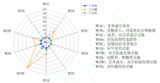 為驗(yàn)證不同霉莧菜梗風(fēng)味差異,使用電子鼻的傳感器確定霉莧菜梗的風(fēng)味成分分類。響應(yīng)強(qiáng)度雷達(dá)圖(圖2)所示,產(chǎn)品A和C的傳感器響應(yīng)強(qiáng)度較小,并且雷達(dá)圖線幾乎重合,但產(chǎn)品C的W1W傳感器響應(yīng)強(qiáng)度略高于產(chǎn)品A。產(chǎn)品B的W1W傳感器響應(yīng)強(qiáng)度達(dá)到最高,W2W、W5S、W1S和W2S傳感器響應(yīng)強(qiáng)度相對(duì)較高,顯示無(wú)機(jī)硫化物、芳香成分、氮氧化合物、甲基類、醇類和醛酮類化合物的風(fēng)味強(qiáng)度,產(chǎn)品B>產(chǎn)品C>產(chǎn)品A。這些結(jié)果說(shuō)明,電子鼻可以有效地區(qū)分不同霉莧菜梗間的氣味物質(zhì)差別。