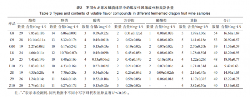 不同產(chǎn)地同一采收時間火龍果的發(fā)酵酒樣品中的揮發(fā)性風(fēng)味成分種類數(shù)多少排序為樣品G8(54)>L8(49)>Z8(40),樣品G9(53)>Z9(49)>L9(48),樣品L10(44)>Z10(40)>G10(39)。