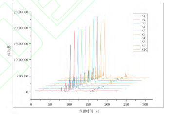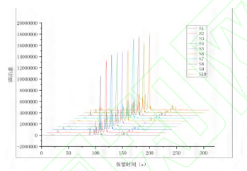 利用電子鼻對(duì)10種不同產(chǎn)地草果樣品進(jìn)行的檢測分析及后續(xù)數(shù)據(jù)處理,獲得了在MXT-5色譜柱和MXT-1701色譜柱上的氣味指紋圖譜,結(jié)果如圖2、圖3所示,觀察到不同產(chǎn)地草果的氣味成分色譜峰在出峰時(shí)間和峰面積上均呈現(xiàn)出明顯差異。若通過比對(duì)放大色譜圖來尋找樣品組間的差異,此過程較為繁瑣與復(fù)雜。為了提高分析效率,故采用先統(tǒng)計(jì)后化學(xué)分析的方法,首先,通過PCA法對(duì)不同產(chǎn)地草果樣品的氣味進(jìn)行統(tǒng)計(jì)分析,識(shí)別氣味上的差異。在PCA分析的基礎(chǔ)上,進(jìn)一步確定差異色譜峰。隨后,利用AroChembase數(shù)據(jù)庫對(duì)這些差異色譜峰進(jìn)行定性分析。