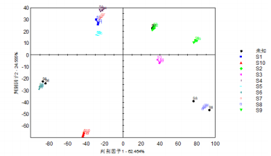 在主成分分析基礎(chǔ)上,對(duì)10種不同產(chǎn)地草果樣品進(jìn)行判別因子分析,分析結(jié)果如圖8顯示,判別因子1判別指數(shù)為62.46%,判別因子2判別指數(shù)為24.56%,不同產(chǎn)地草果樣品組內(nèi)分布集中且離散程度小,組間分布離散程度大,表明該分析方法能夠有效地區(qū)分不同產(chǎn)地的草果樣品。進(jìn)一步地,將3種不同產(chǎn)地的草果未知樣本的圖譜信息投射到已建立的DFA模型中,每種未知樣本均設(shè)置了兩組重復(fù)。如圖8所示,通過模型判定,3種未知樣本分別被準(zhǔn)確歸類到S2、S6和S8三個(gè)不同的產(chǎn)地。具體到每個(gè)未知樣本,歸屬于S2產(chǎn)地的樣本識(shí)別準(zhǔn)確率分別為98.9%和99.2%,歸屬于S6產(chǎn)地的樣本識(shí)別準(zhǔn)確率分別為95.5%和94.2%,而歸屬于S8產(chǎn)地的樣本識(shí)別準(zhǔn)確率分別為81.7%和97.2%。這些結(jié)果表明,DFA模型對(duì)于未知草果樣品的判別具有較高的準(zhǔn)確性。因此,基于DFA模型的分析,可以快速而準(zhǔn)確地鑒定草果的產(chǎn)地,為草果的產(chǎn)地溯源提供了一種有效的技術(shù)手段。